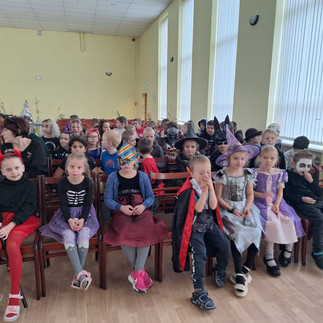 Skolas svinību zāli bija ieņēmuši zirnekļi un ierīkojuši sev tur pilsētiņu. Sākumskolas skolēni kopā ar mazajiem Ežukiem vai, pareizāk sakot, dažādi mazi mošķīši bija pārcēlušies uz zirnekļu pilsētiņu, kur viņus svinīgā masku gājienā, kopīgās rotaļās un dejās. aicināja Zirneklīte un Lords Voldermorts. Bērnu tērpus, kuri piedalījās masku parādē, vērtēja šausmīgi kompetenta žūrija. Izvēle bija grūta, bet kopīgi apspriežoties, tika iedalītas godalgotas vietas. Pateicības, saldumu kastes saņēma visu klašu bērni.